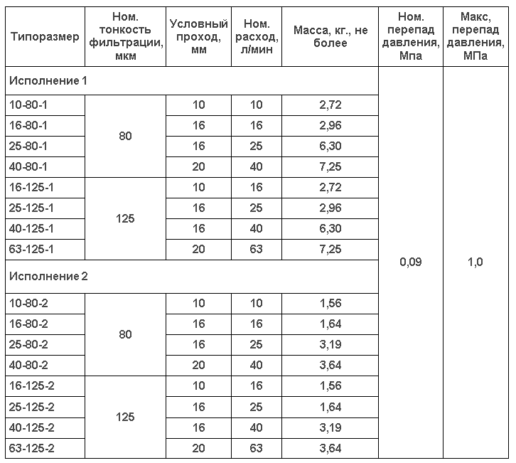 - Исполнение 1 -- 10-80-1, 16-80-1, 25-80-1, 40-80-1, 16-125-1, 25-125-1, 40-125-1, 63-125-1) — в корпусе с резьбовым присоединением (К - коническая резьба, М - метрическая резьба), монтируемые на трубопроводе;