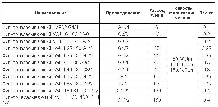 Технические характеристики фильтров всасывающих типа W