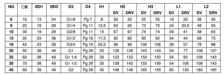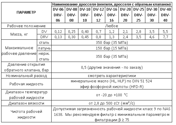 Технические характеристики гидровентилей DRV