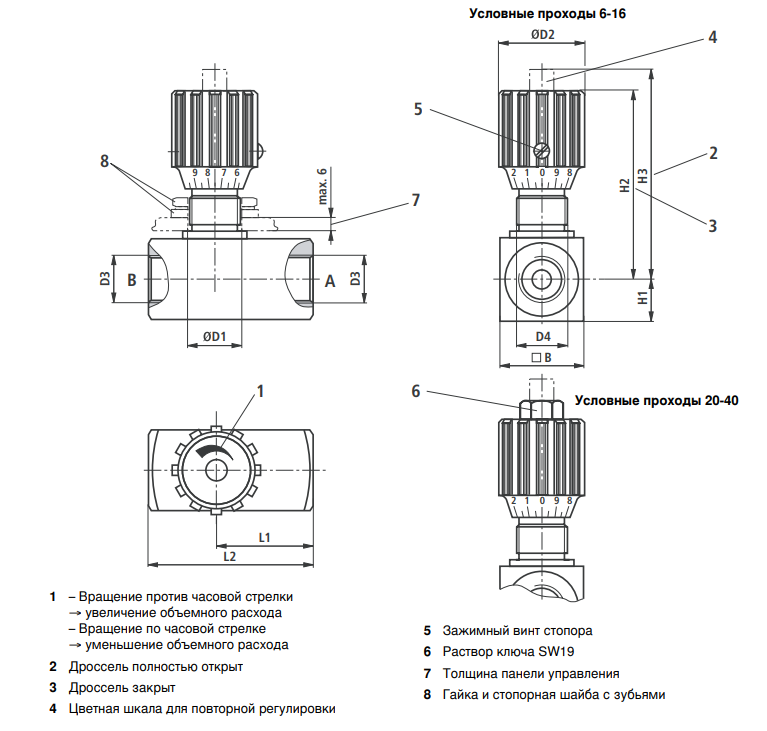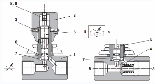 При повороте регулирующей рукоятки (2) вправо шток (5) с дроссельной иглой (7) уменьшает проходное сечение (6) до полного перекрытия потока. Цветная шкала (8), связанная со штоком, позволяет повторять установку.Площадь цветного треугольника (9) показывает степень открытия проходного сечения (чем больше площадь треугольника, тем больше открытие).