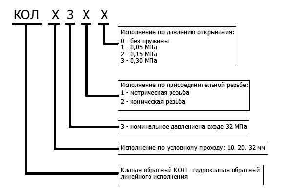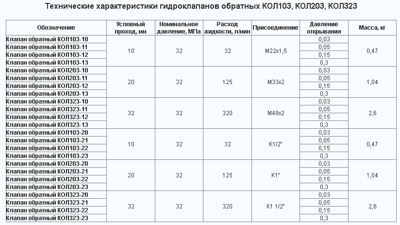 Гидроклапаны обратные КОЛ 103, КОЛ 203, КОЛ 323, с диаметром условного прохода 10, 20 и 32 мм соответственно, предназначены для обеспечения в объемных гидроприводах свободного потока рабочей жидкости в одном направлении и перекрытия потока в обратном направлении.