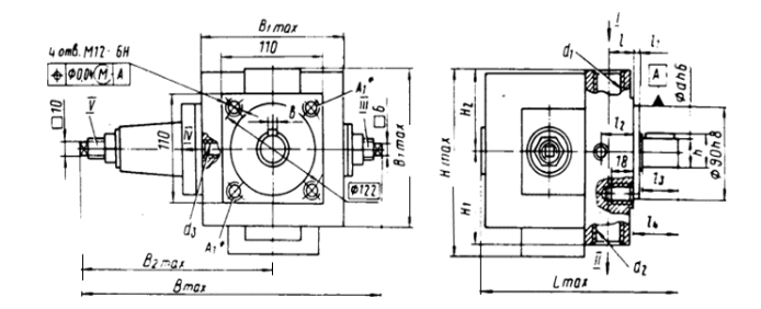 | Типоразмер | B | B1 | B2 | b | H | H1 | H2 | h | L | l1 | l2 | l3 | l4 | d | d1 | d2 | d3 |
