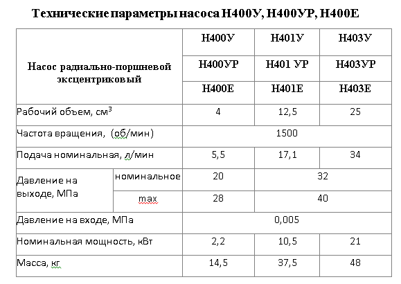 Насосы Н400Е, Н401Е, Н403Е - радиально-поршневые эксцентриковые реверсивные, предназначены для работы в гидроприводах машин и механизмов, где необходимо давления 20 МПа (насос Н 400 Е) и 32 МПа (насосы Н401 Е и Н 403 Е) и реверсируемый по направлению, нерегулируемый по величине поток рабочей жидкости.