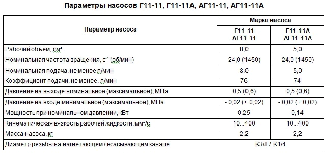 Насосы шестеренные Г11-11,  Г11-11А  применяются в гидравлических и смазочных системах металлообрабатывающего оборудования, прессов, подъемников и других машин. Предназначены для нагнетания под номинальным давлением постоянного по величине и направлению потока минерального масла в смазочные системы станков и других стационарных машин. Допускается применять насосы и насосные агрегаты в гидравлических системах.В обычном исполнении насосы Г11-11А изготавливаются с правым вращением приводного вала. Привод насоса должен осуществляться через упругую муфту, комплектующую колебания, ударные нагрузки и несоосность валов привода и насоса. Насосы могут  устанавливаться в горизонтальном или вертикальном положении на жестком основании, исключающем вибрации.
