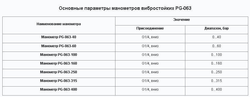 Манометры PG-63 бывают с диапазонами измерения давления на 10, 25, 40, 60, 100, 160, 250, 310 и 400 бар.
