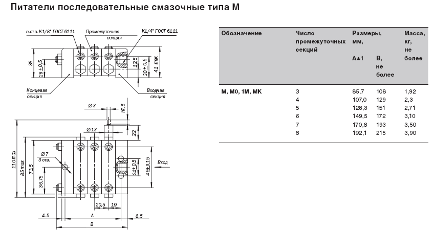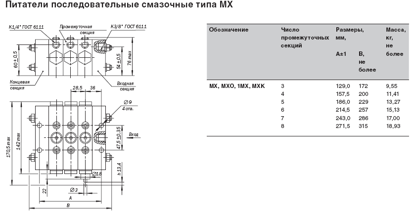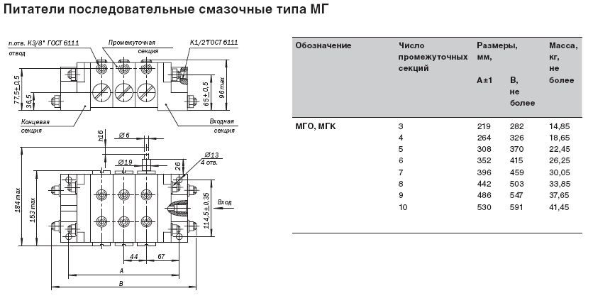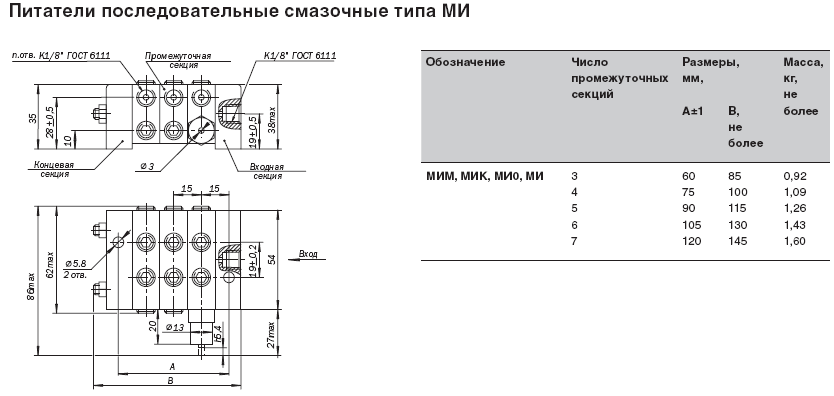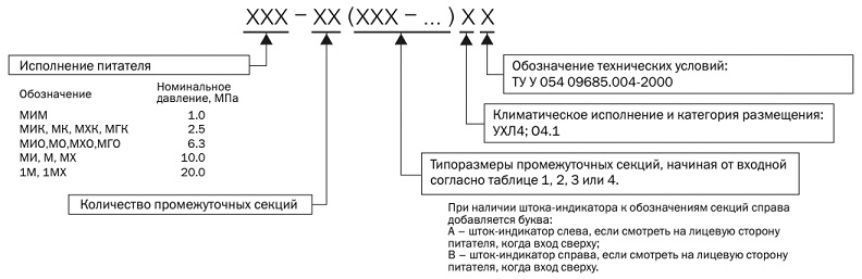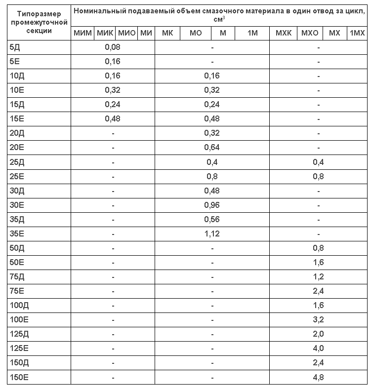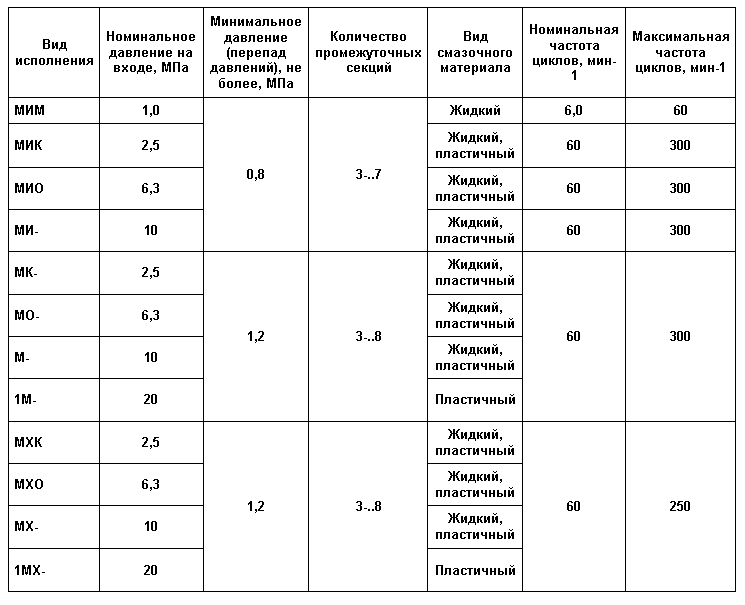 Питатель состоит из набора секций – – входной, выходной – и пакета промежуточных секций, уплотнённых по стыкам прокладками или уплотнительными кольцами и стянутых шпильками. В каждой промежуточной секции находится трёхпоясковый золотник, имеющий свободных ход и совершающий возвратно-поступательное движение. Золотники в промежуточных секциях перемещаются в определённой последовательности. Рабочий ход питателя, заключающийся в вытеснении определённой дозы смазочного материала в точку смазки, произойдет тогда, когда все золотники совершат возвратно-поступательное движение. Питатель может начать работу независимо от начального положения золотника. Каждая промежуточная секция имеет два отвода в точки смазки. Получить один отвод в золотниковой секции можно, соединив два отвода. При этом один из отводов должен быть обязательно заглушен. Секции с одним отводом производят за цикл двойную номинальную подачу смазочного материала. Питатель может быть укомплектован узлом со шток-индикатором, фиксирующим завершение цикла питателя. Наличие штока-индикатора позволяет контролировать работу питателя визуально или с помощью электросигнальных приборов. Шток-индикатор устанавливается на любой из промежуточных секций по необходимости. В секциях Питатель типа МИ питателей МИ: 5Д, 5Е; питателей МО, М, 1М, 10Д, 10Е, 15Д, 15Е; питателей МХО, МХ, 1МХ: 25Д, 25Е; питателей МГО: 150Д, 150Е шток-индикатор не устанавливается. В питателе могут быть применены промежуточные секции любого типоразмера (но в пределах каждого исполнения по габариту). Предпочтительное расположение промежуточных секций питателей МХО, МХ, 1МХ в порядке возрастания цифр условных обозначений типоразмеров (начиная от ближайшей к входу смазочного материала). Предпочтительное расположение секций остальных исполнений питателей по габаритам – в обратном порядке.Технические характеристики питателей последовательных смазочных